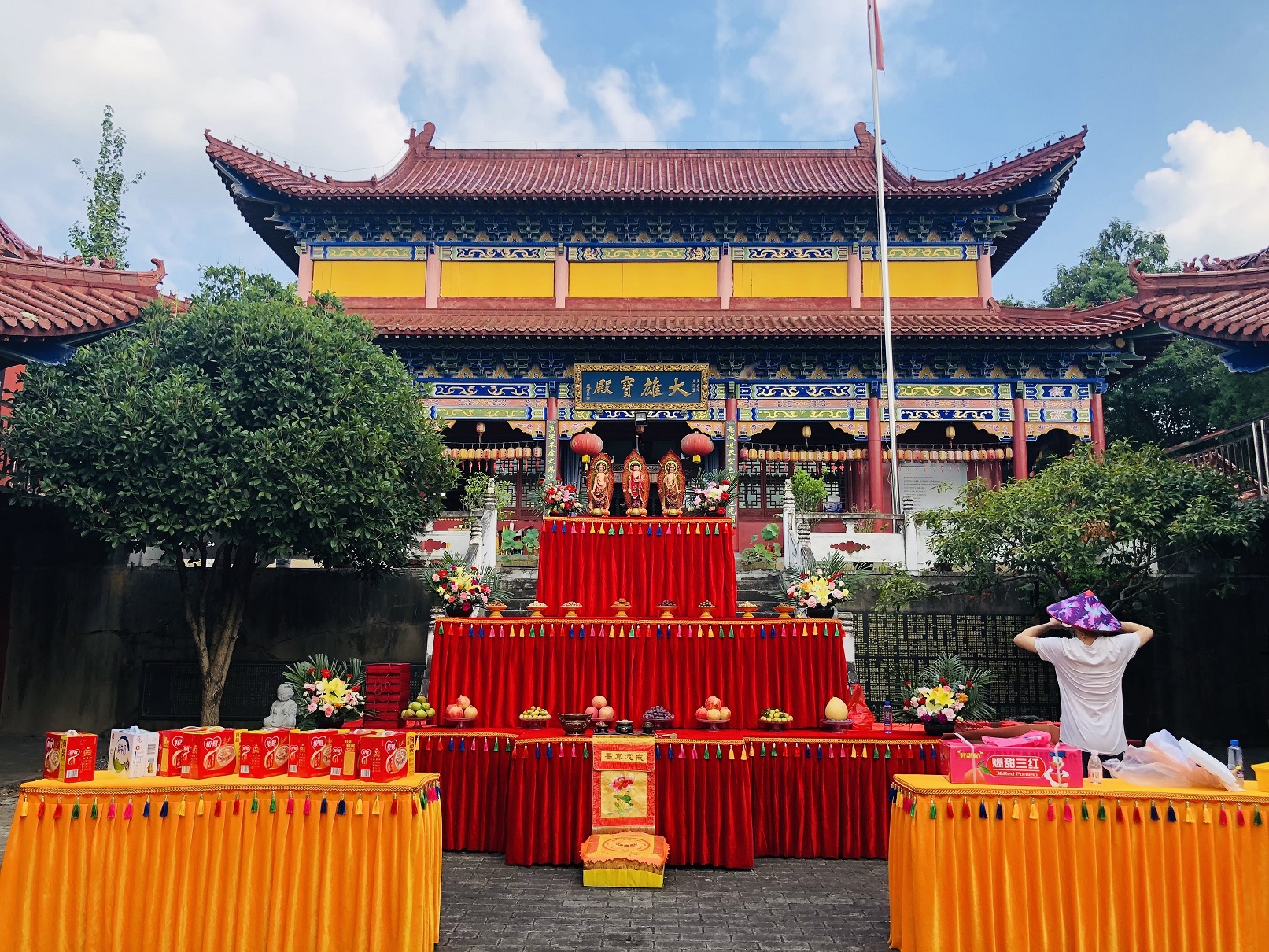 晚19时30分,凉风习习,寺院依照佛教仪轨设百味妙供,香、花、灯、果等,法师拈香主法,并率两序大众礼请月光菩萨,向月光菩萨献上最虔诚的礼拜,祈愿月光菩萨加被正法久住。古刹上空梵音袅绕,云开月现,古刹内月光遍照。